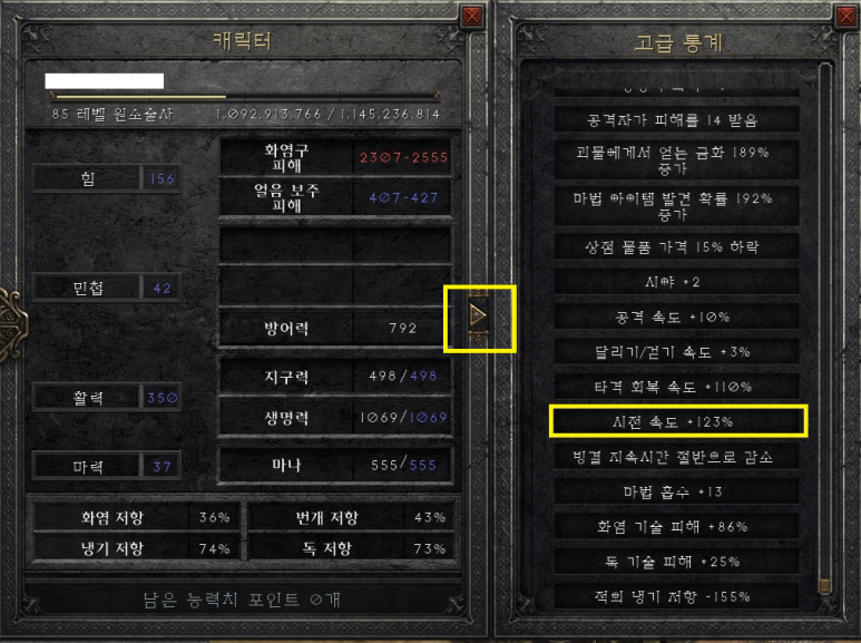 캐릭터 시전 속도는 A를 눌르고 화살표를 누르면 수치를 확인할 수 있습니다.